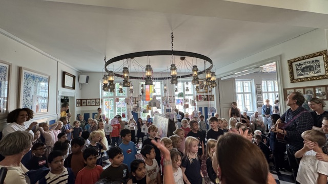 Så bliver Sebastian fra 2. klasse løftet op på flyglet, han fortæller, at han skal rejse til Boston i fire måneder og gå i skole derovre. Mette fra 2. klasse foretrækker at stå på gulvet, mens hun fortæller, at hendes faster har fået en papegøjeunge, der siger tingene efter, når de snakker, og til sidst spiller Andreas et stykke musik på flyglet og høster stort bifald. Henrik Jørgensen følger musikindslaget op med en historie om Mozart som barn og sætter et stykke af "Tryllefløjten" på, og også dét lytter børnene interesseret til. Der er under hele morgensangen et behageligt fravær af fnisen, smarte bemærkninger og dertil hørende shhh'er fra lærerne.